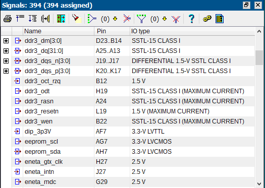 The Signal view is used to assign location constraints and IO standards to signals. The data can be retrieved from the constraints, CSV file(s), a VHDL / Verilog file or imported from the PCB data. The import can suppress LVDS negative signals and different ways to edit groups of signals are available. The view can be used to create locations constraints using drag & drop to the pin- or device view; create a VHDL entity or Verilog module, exported to a CSV file or used to wire FPGA symbols in a schematic.